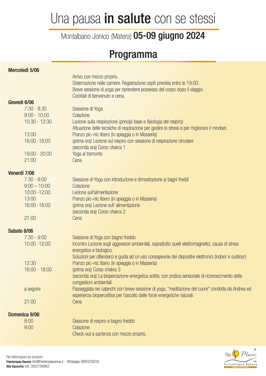Attraverso pratiche millenarie come lo yoga, tecniche di respirazione, principi di alimentazione secondo metodo ReMove® di Fisioterapia Ranoia, con cenni di biohacking, validati dagli ultimi studi scientifici in merito, scopriremo come affrontare con gioia ed entusiasmo la propria esistenza.